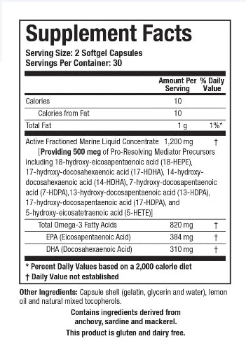 Biomega-SPM™ delivers an industry-leading 500 μg/serving of SPM precursors—specific omega-3 metabolites that serve as the foundational building blocks for Specialized Pro-Resolving Mediators (SPMs) produced naturally by the body. Utilizing a proprietary supercritical extraction with 8-stream fractionation, our comprehensive formula features 7 identified precursors to SPMs that support the body's resolution phase in the inflammatory cascade.* This advanced approach promotes joint and muscular comfort, healthy tissue repair, and balanced immune and inflammatory support*—all in an easy-to-take softgel designed for optimal patient compliance.