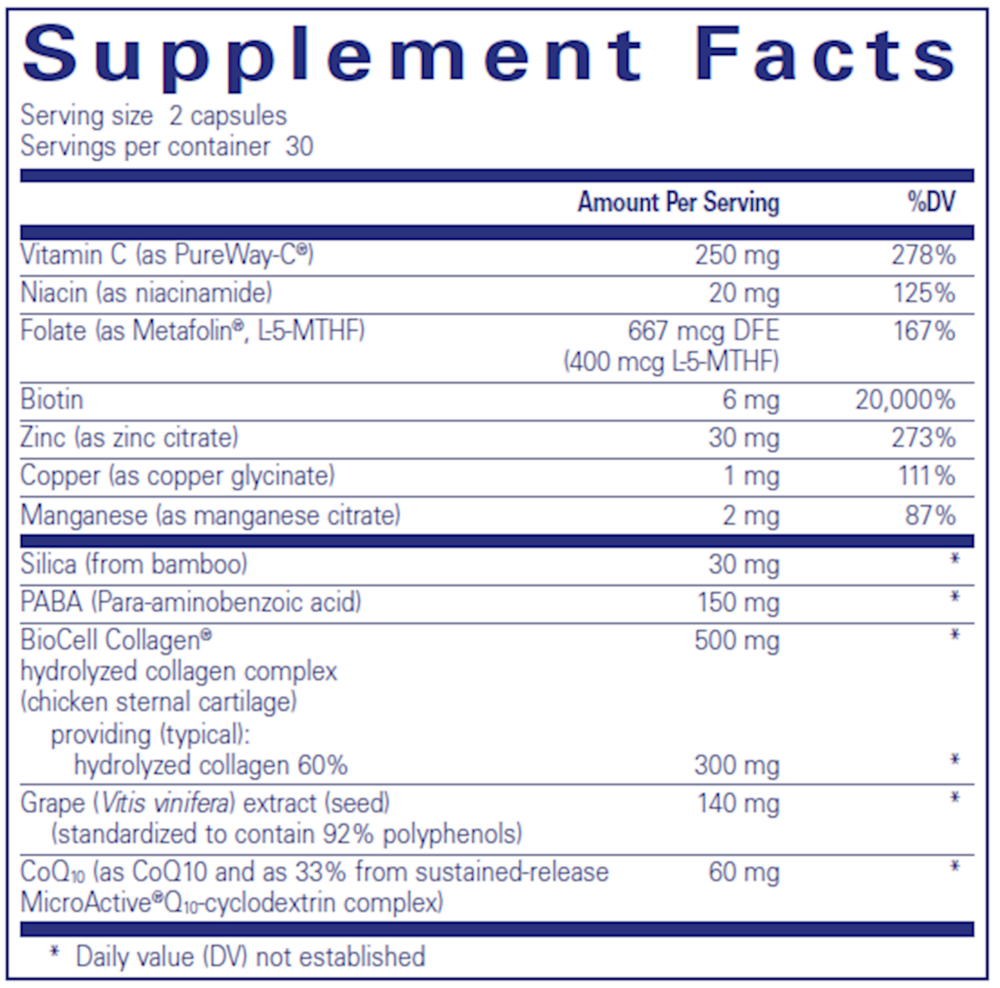 Vitamin C, zinc, copper, manganese and silica are integral collagen and keratin cofactors, promoting skin elasticity. Optimal levels of these nutrients, as well as folate, have been associated with healthy hair, skin, and nails. PureWay-C®, a rapidly absorbed enhanced retention vitamin C, supports skin resiliency and helps counter the effects of oxidative stress along with sustained-release CoQ10 complex. Niacinamide and zinc promote immune function in the skin. The proanthocyanidins in grape seed extract help to stabilize collagen and elastin by moderating the proteolytic enzymes collagenase and elastase.